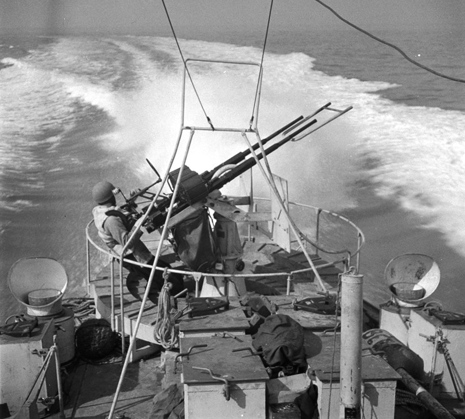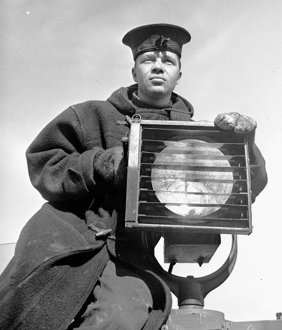 Signal Lamp and rating on a Fairmile motor torpedo boat, 1943. The Officer is Albert “The Beard” Morrow Co of MTB 726 of the RCN 65th MTB Flotilla. The most photographed officer in the RCN during the Second World War. They operated in the Mediterranean Sea. (T.L. Logie, from The Champagne Navy)
