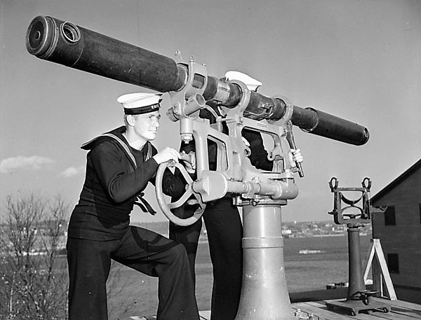 Able Seaman J.P. Clements, sighting his Town class destroyer’s US pattern 4-inch/50 gun. He is wearing woolen clothing supplied by The Canadian Red Cross Society, Halifax, Nova Scotia, 5 February 1943.He is wearing woolen clothing supplied by the Canadian Red Cross Society, Halifax, Nova Scotia, 5 February 1943.