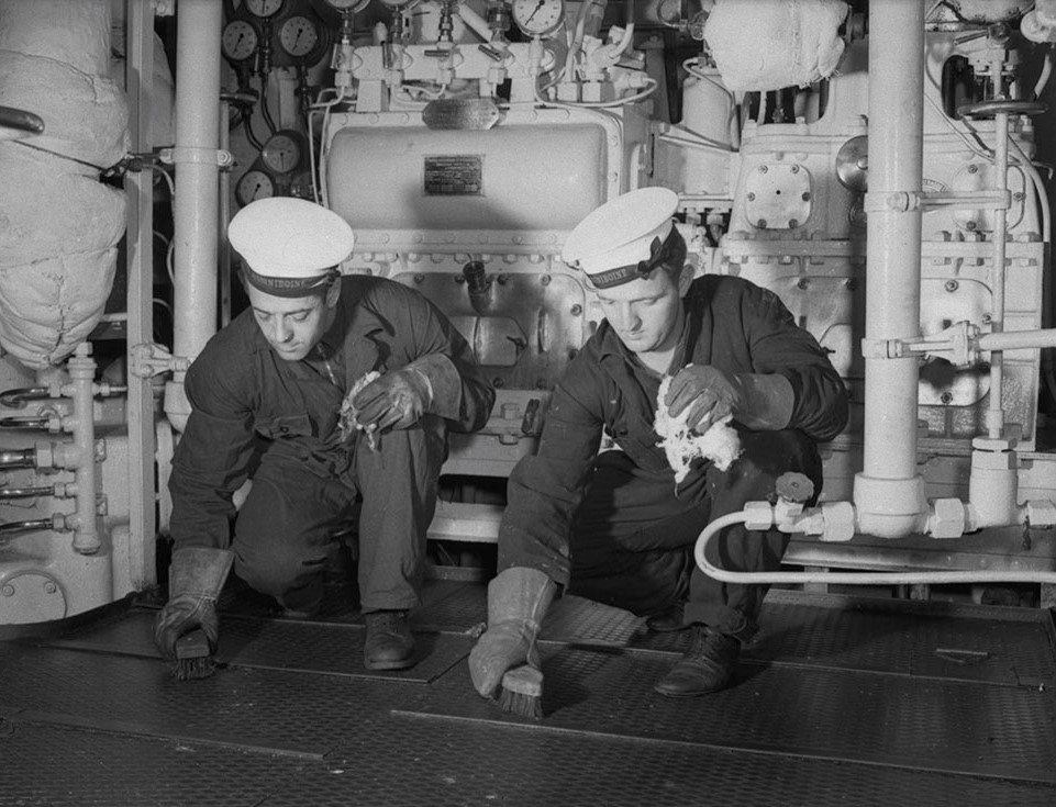 Ratings scrubbing plating in engine room of HMCS Assiniboine, November 1940.