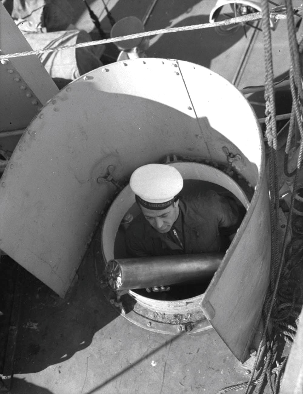 View of the QF 4.7-inch Mk. IX gun on the foc’sle of HMCS Assiniboine showing “B” gun and the fog lookout closed up in the eyes of the ship. The gun crew are visible sheltering behind the shield.