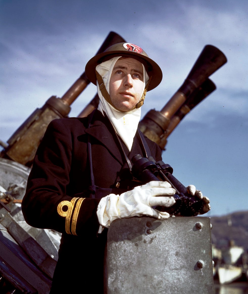 Lt. William P. Hayes, HMCS Iroquois Anti-Aircraft Officer, in anti-flash gear, April 1943.
