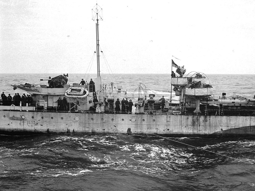 Three nights later, HMCS Athabaskan and HMCS Haida, under Commander Harry De Wolf, were on patrol in mid-Channel when they were ordered to intercept two German destroyers (survivors of the earlier battle) heading westward along the French coast. HMCS Athabaskan’s radar soon detected the enemy ships; minutes later, the Tribals opened fire, then altered course towards the enemy to ‘comb’ possible torpedoes (that is, turn parallel to incoming torpedoes). In spite of this maneuver, a torpedo found HMCS Athabaskan.