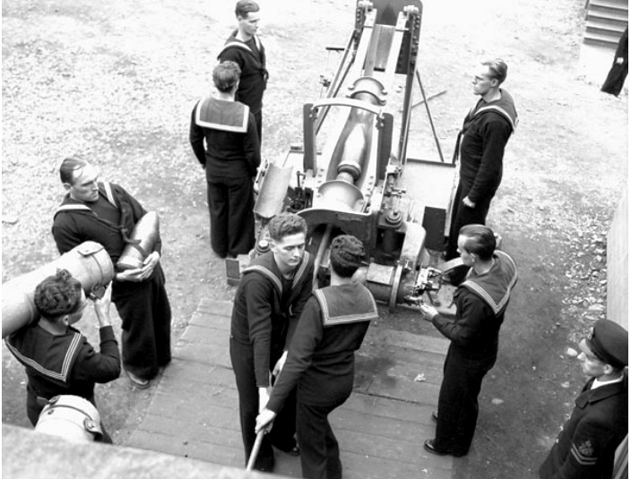 Naval ratings practising the loading and firing of a six-inch gun, Royal Canadian Navy Gunnery School, Halifax, Nova Scotia, Canada, 1940.