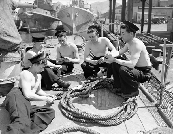 (Library and Archives Canada Photo, MIKAN No. 3238928)Sailors playing cards aboard the Fairmile motor launch Q078 of the Royal Canadian Navy, St. John’s, Newfoundland, 10 June 1943.