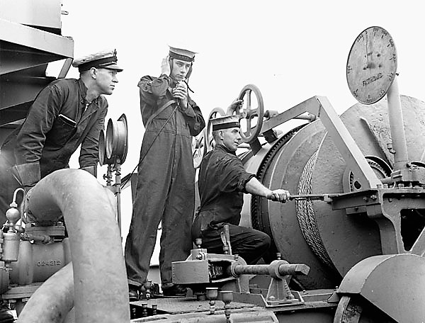Personnel of HMCS Alberni paying out cable during a minesweeping exercise off the coast of British Columbia, March 1941.