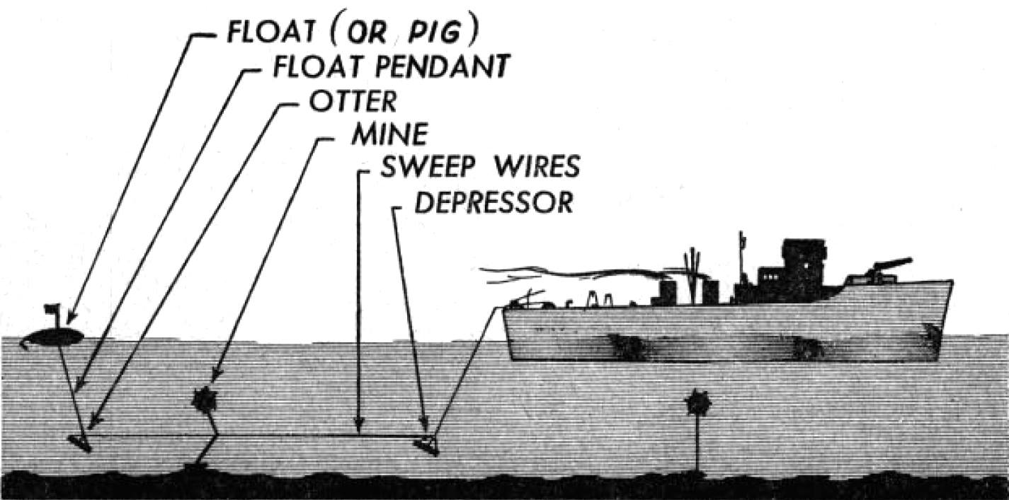 It is also known in minewarfare as an Oropesa float. Sweeping could be either “single O” (i.e. a single sweep to port or starboard) or “double O” (sweeps to both port and starboard). Multiple sweepers could be deployed in formation (on a line of bearing) where only the lead sweeper is passing through unswept water, with sweepers using either single or double O as ordered. Another technique used was team sweeping – this did not require the use of the Oropesa floats, instead the sweep wire would be towed between two sweepers with a hydro-mechanical “kite” used to regulate the depth of the sweepwire. (Andy Ashworth)
