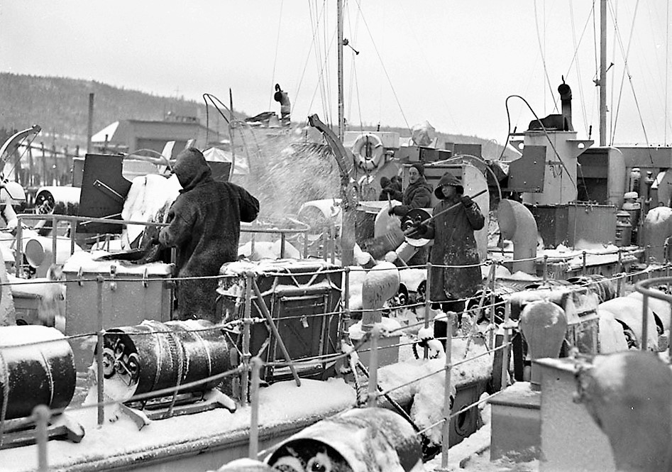 Ratings clearing ice from the forecastle of HMCS Lunenburg, Halifax, Nova Scotia, January 1942.