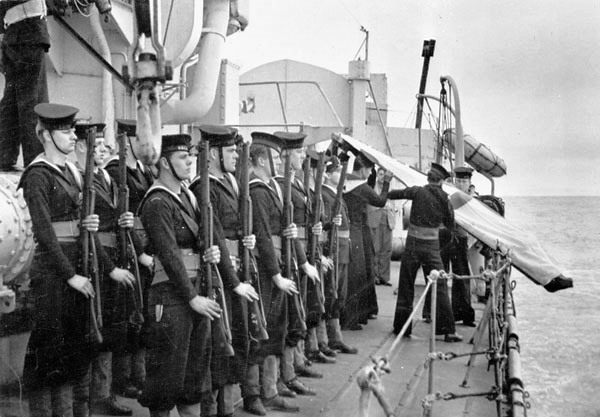Burial at sea of Ordinary Seaman Kenneth Watson of HMCS Assiniboine, who died in the action which resulted in the sinking of a German submarine on 6 August 1942.