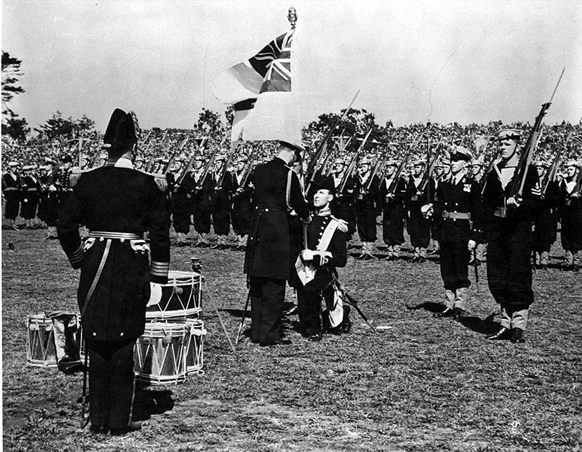King George VI presenting the King’s Colour to the Royal Canadian Navy during a ceremony in Beacon Hill Park, Victoria, British Columbia, 30 May 1939.