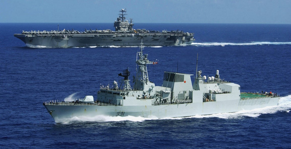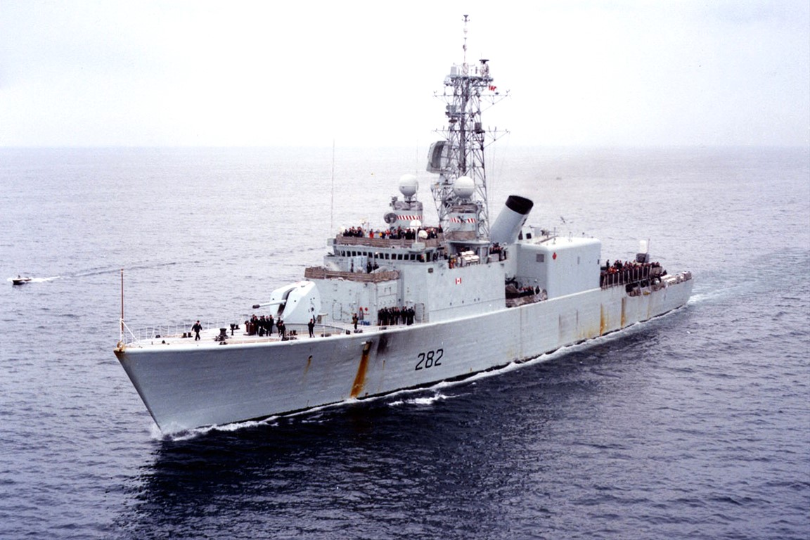 Through the late 1990s, the Halifax-class frigates operated as fully integrated elements of United States Navy (USN) carrier battle groups in the Persian Gulf region, such as Vancouver here with the USS John C. Stennis.