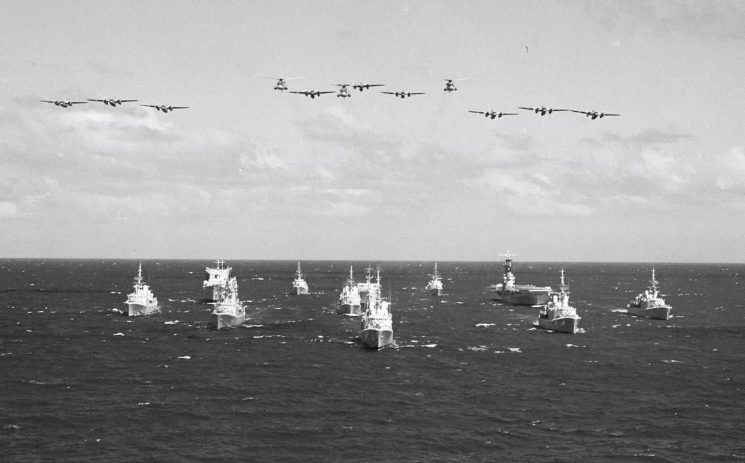 RCN Atlantic fleet with HMCS Bonaventure’s aircraft in formation (3 Sea Kings and 9 Trackers) flying overhead in 1968.
