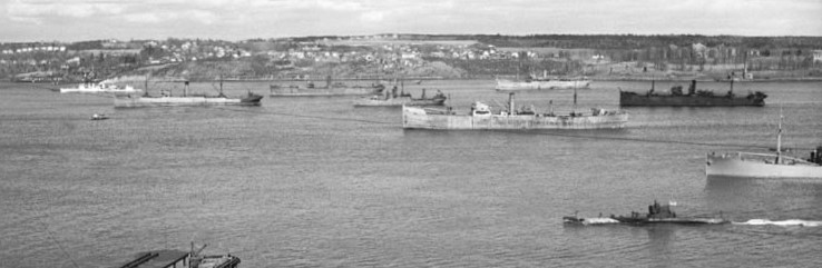 Convoy assembly in the Bedford Basin, Halifax, for merchant ships destined for the UK.