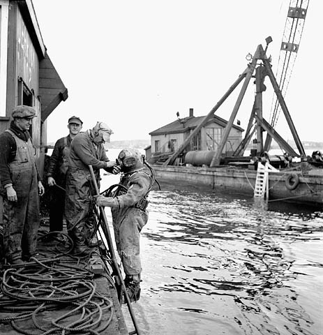 This photo is captioned “Diver adjusting his helmet before conducting a salvage operation on the cargo of a wreck in an eastern Canadian port, July 1943”.  The dive may be taking place near the entrance to Halifax harbour, with the salvage being conducted on one of the Merchant cargo ships torpedoed there.
