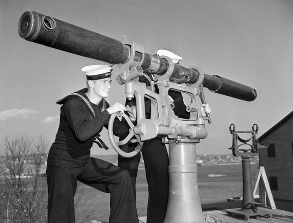 RCN sailor operating a Rangefinder, RCN Gunnery School, Halifax, 1940.