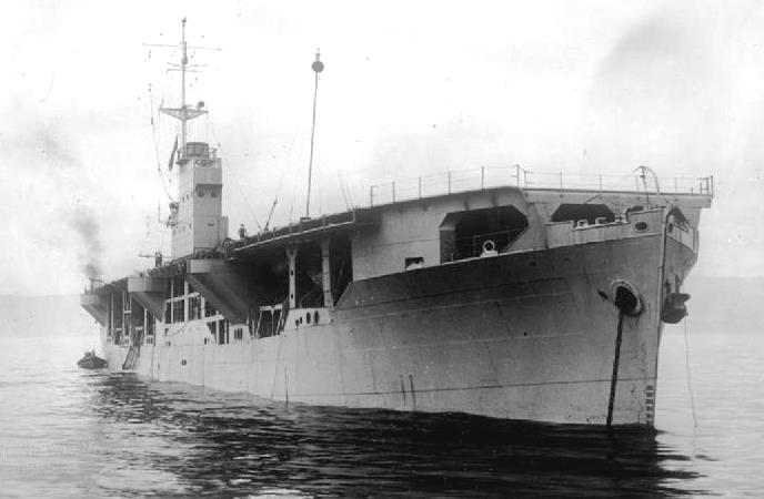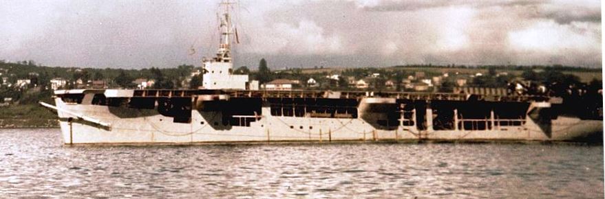Royal Navy merchant aircraft carrier (tanker type) ship in an Atlantic port.