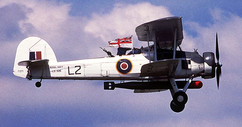 A Royal Navy Fairey Swordfish Mk. II (Serial No. LS326), in flight during Air Fete 1988. These were flown from the decks of the MACs.