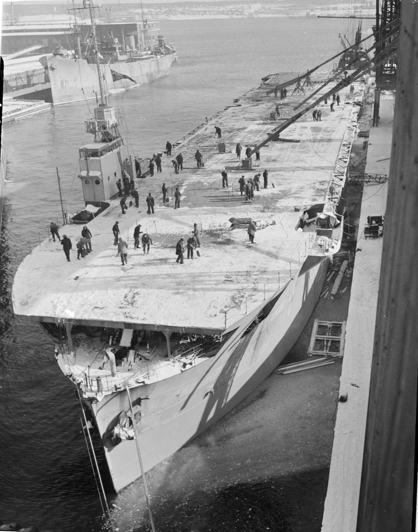 Alterations and additions on Royal Navy Merchant Escort Carrier (MAC) at Lapointe Pier, Vancouver, c1943-1944. She is loading grain through chutes.