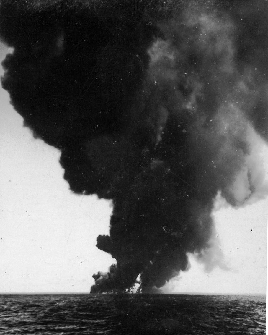 Smoke from a burning tanker torpedoed in the North Atlantic.