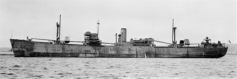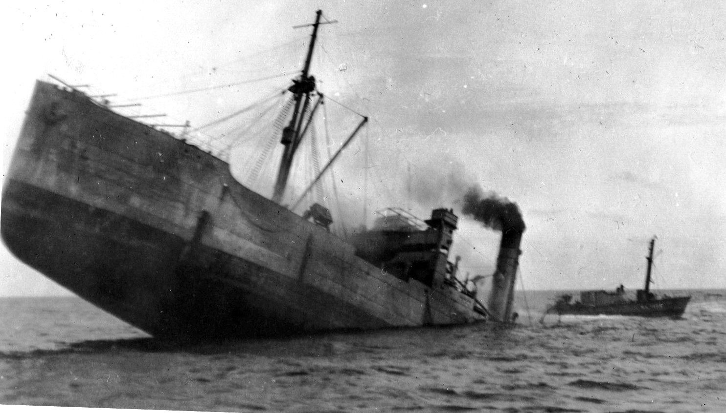 Another emergency turn by the convoy brought two hours of suspenseful quiet while HMCS Orillia aided Tahchee and searched for survivors astern of the convoy.  Then U-432 torpedoed the 3205-GRT Dutch freighter Winterswijk and the 1113-GRT Norwegian freighter Stargard.  The freighter Regin stopped to rescue Starguard’s survivors and opened fire on a surfaced U-boat.   While HMCS Skeena and HMCS Kenogami searched for U-boats around the stricken Winterswijk and Stargard, U-81 torpedoed the 3252-GRT British freighter Sally Maersk, and the convoy made another emergency turn to avoid a surfaced U-boat.  U-82 torpedoed the 7465-GRT British CAM Empire Hudson less than two hours after HMCS Skeena regained station ahead of the convoy.[9]