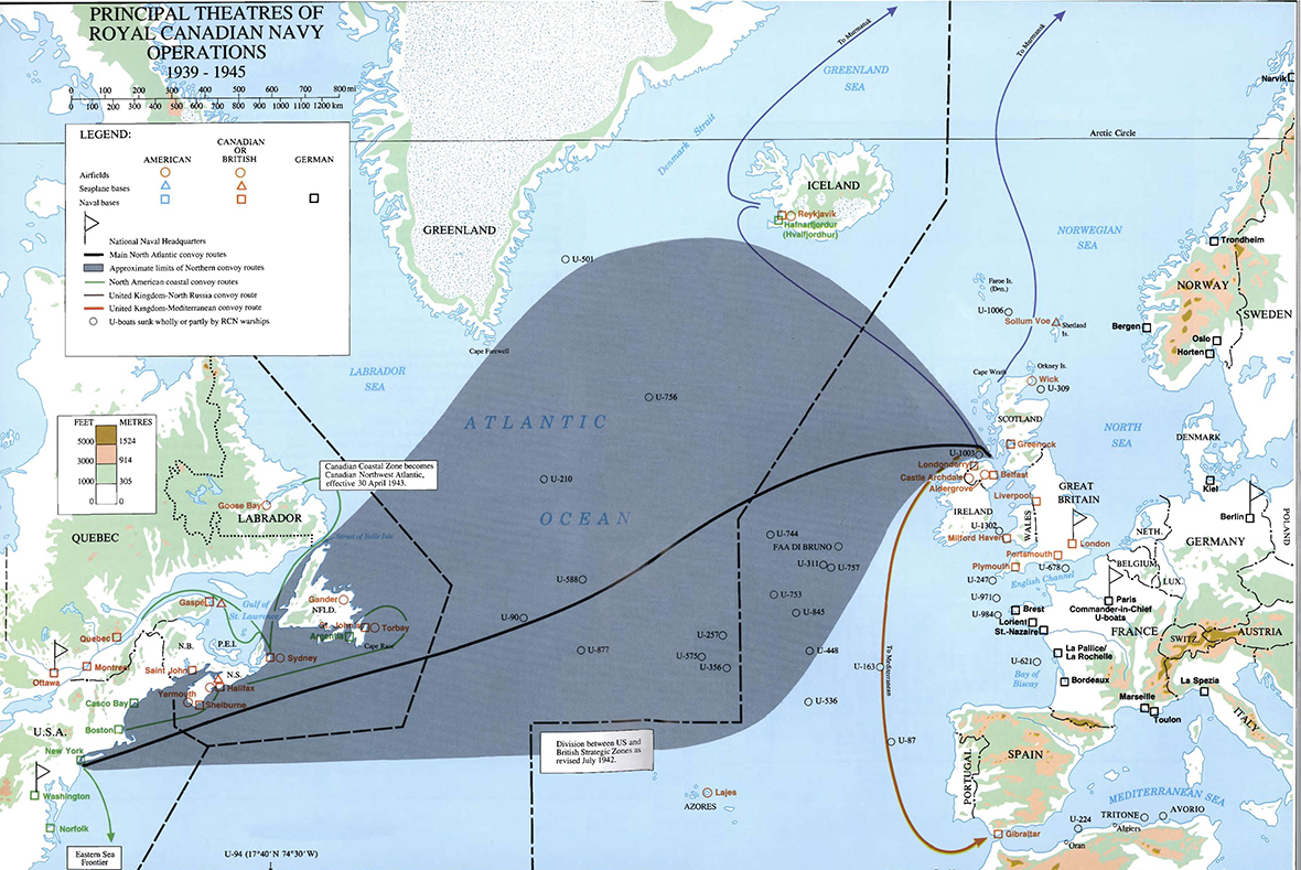 Map of RCN Operations during the Battle of the Atlantic. (The battle areas in the Gulf of St. Lawrence and on the routes to Murmansk are not shown)