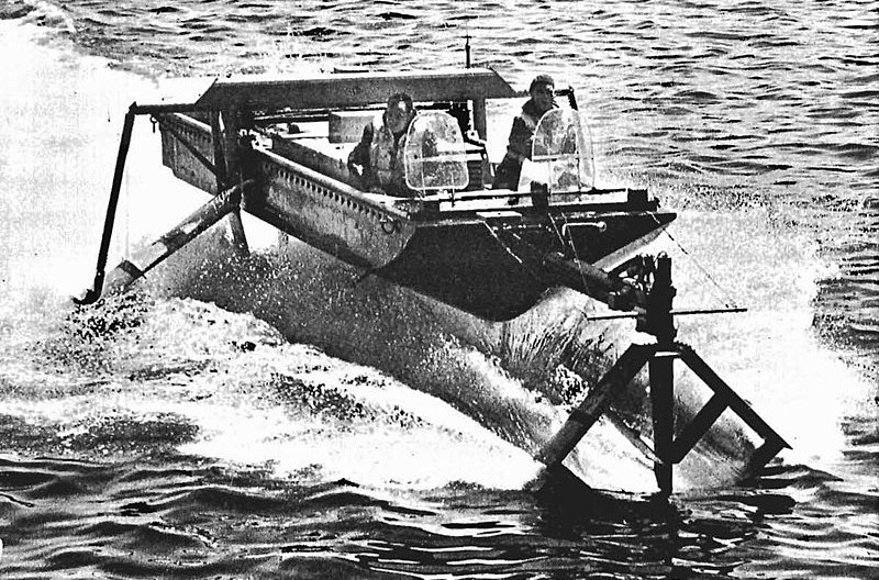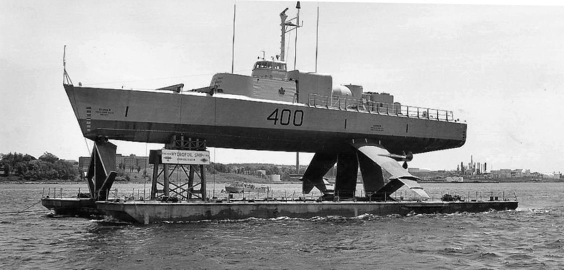Hydrofoils protruding from the hull allowed HMCS Bras d’Or (FHE 400) to soar above the water in tests in the 1970s, reaching speeds of 63 knots (116 kilometres per hour).