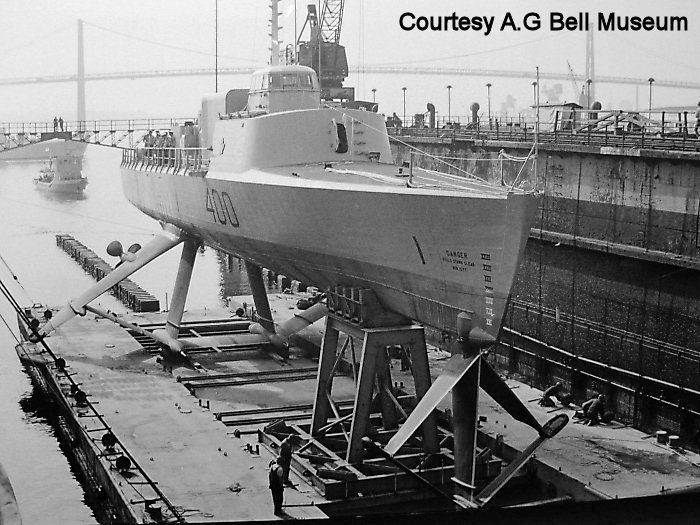 HMCS Bras d’Or was named in honour of Bras d’Or Lake on Cape Breton Island, Nova Scotia, where inventor Alexander Graham Bell performed hydrofoil experiments in the early 20th century near his estate and new laboratory at Beinn Bhreagh, setting the world watercraft speed record in the process. In 1909 the lake was also the historic site of the first flight of an aircraft in Canada and the British Commonwealth; the airplane, named the “Silver Dart“, was built by the Aerial Experiment Association under Dr. Bell’s tutelage. The lake’s name was thus fitting for a hydrofoil vessel which could ‘fly’ above an ocean’s surface.