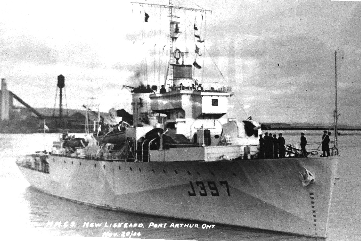 HMCS New Liskeard (J397) (Algerine-class).  Built at Port Arthur, Ontario, she was commissioned there on 21 Nov 1944.  HMCS New Liskeard arrived at Halifax on 15 Dec 1944 and proceeded to Bermuda for workups in Mar 1945.  Upon her return in Apr 1945 she was assigned to EG W-8 of Western Escort Force.  When EG W-8 was disbanded in Jun 1945, she was allocated to HMCS Cornwallis as a training ship from Jul to Sep 1945.  She was then placed in maintenance reserve, first at Sydney and then at Halifax, until the end of the year.  Refitted at Halifax, she was re-commissioned (168) on 9 Apr 1946, as a training ship for cadets.  On 22 Apr 1958, she was paid off for conversion to an oceanographic research vessel, serving as such until 1 May 1969.  Later that year she was taken to Dartmouth Cove, NS, and broken up.