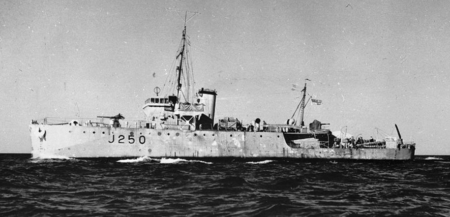 HMCS Burlington (J250). Built by Dufferin Shipbuilding Co., Toronto, Ontario, she was commissioned at Toronto on 6 Sep 1941, and arrived at Halifax on 30 Sep 1941. After working up, she made Halifax her base, and in Mar 1942, was assigned to WLEF, transferring in May to Gulf Escort Force. Late in Dec 1942 she commenced refitting progressively at Halifax, Lunenburg and Dartmouth. Following completion of the work in May 1943, she worked up at Pictou and was assigned in June to EG W-9 of WLEF. In Feb 1944, she was transferred to Halifax Local Defence Force, and in Sep 1944 sent to Bermuda for a month’s workup. On her return she joined Newfoundland Force, based at St. John’s and served there until the Command was disbanded. On 4 Jan 1945, U-1232, commanded by Kapt. Kurt Dobratz, attacked convoy SH-194 off (what is today) Egg Island bell buoy. After torpedoing several ships, the convoy’s escort, aided by ships from Halifax, including HMCS Burlington, searched for the U-boat. During the search, HMCS Burlington and ML Q116 collided – holing the Burlington’s hull and severely damaging Q116s bow. Following repairs in Halifax, HMCS Burlington continued to be employed on convoy escort duties. She engaged in a hunt for another submarine in early March. On 22 Apr 1945 she once again went for a short refit. By the time it was finished the war with Germany had ended. She then engaged in miscellaneous duties until she was paid off on 30 Oct 1945, and was sold in 1946 to T. Harris of New Jersey in 1946. She was later broken up.