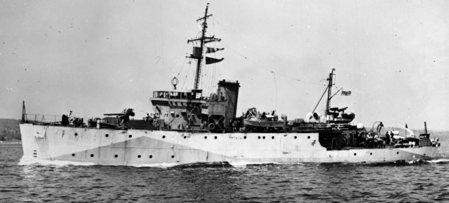 HMCS Goderich (J260). Visible at top centre are two aerial depth charges and a Yagi antenna for Mk. II ASV radar.