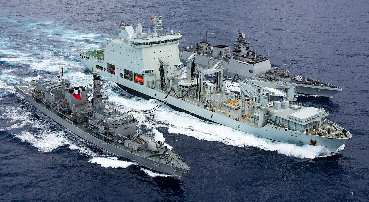 MV Asterix replenishes the Chilean Navy frigate Almirante Lynch (FF-07) and Indian Navy frigate INS Sahyadri (F49) off Hawaii on 28 July 2018.