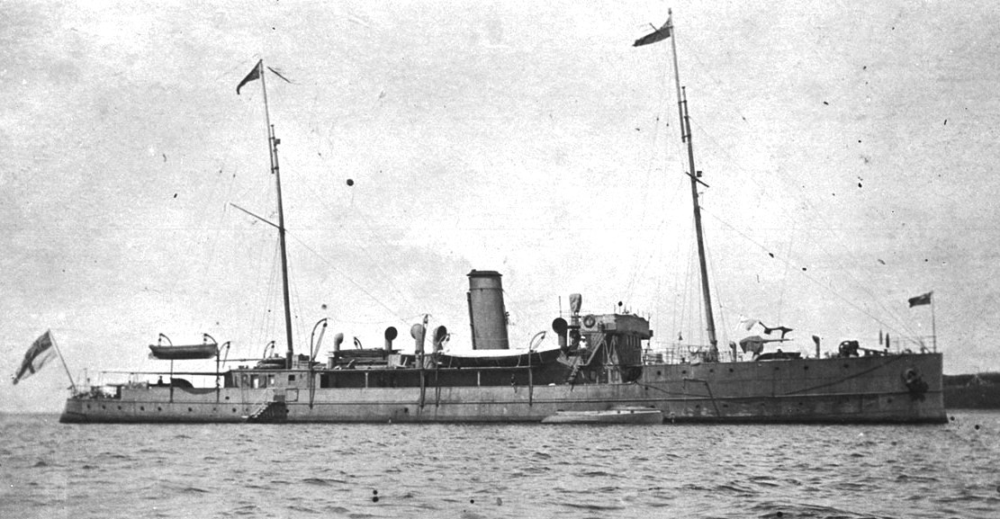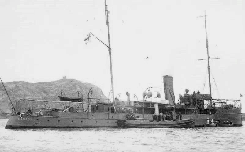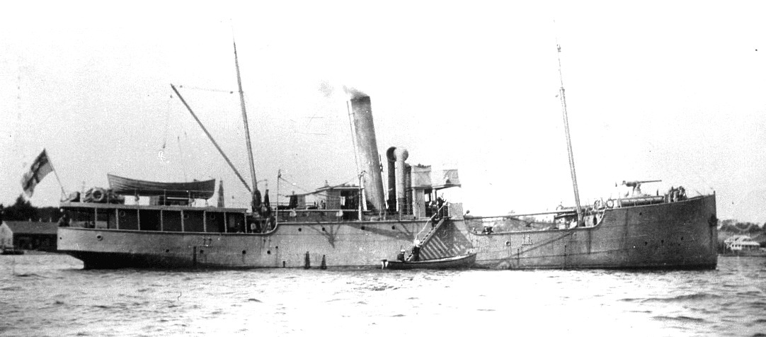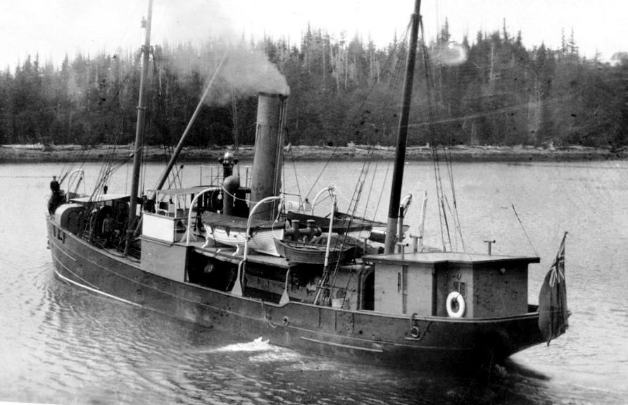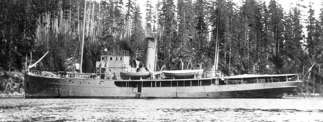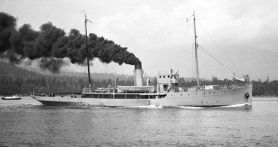 HMCS Lady Evelyn (converted from civilian use).  Built by Tranmere, UK for a Blackpool firm and originally named Deerhound, she was acquired and renamed by the Postmaster-General’s department in 1907.  Lady Evelyn‘s new function was to meet transatlantic mail steamers in the Gulf of St. Lawrence and take off the mail for transfer to trains.  She was commissioned HMCS Lady Evelyn in the RCN as a patrol vessel from Jun 1917 to 1919, and survived in commercial service on the west coast until shortly before the Second World War.  Her armament was one 12-pounder gun.  The Howe Sound Navigation Co. brought the screw steamer Lady Evelyn a former Canadian mail packet on the St. Lawrence, to Vancouver in 1921 for operation with Brittania.  In 1923 she was bought by the Union Steamship Company of British Columbia and remained with them until 1936, when she was scrapped.