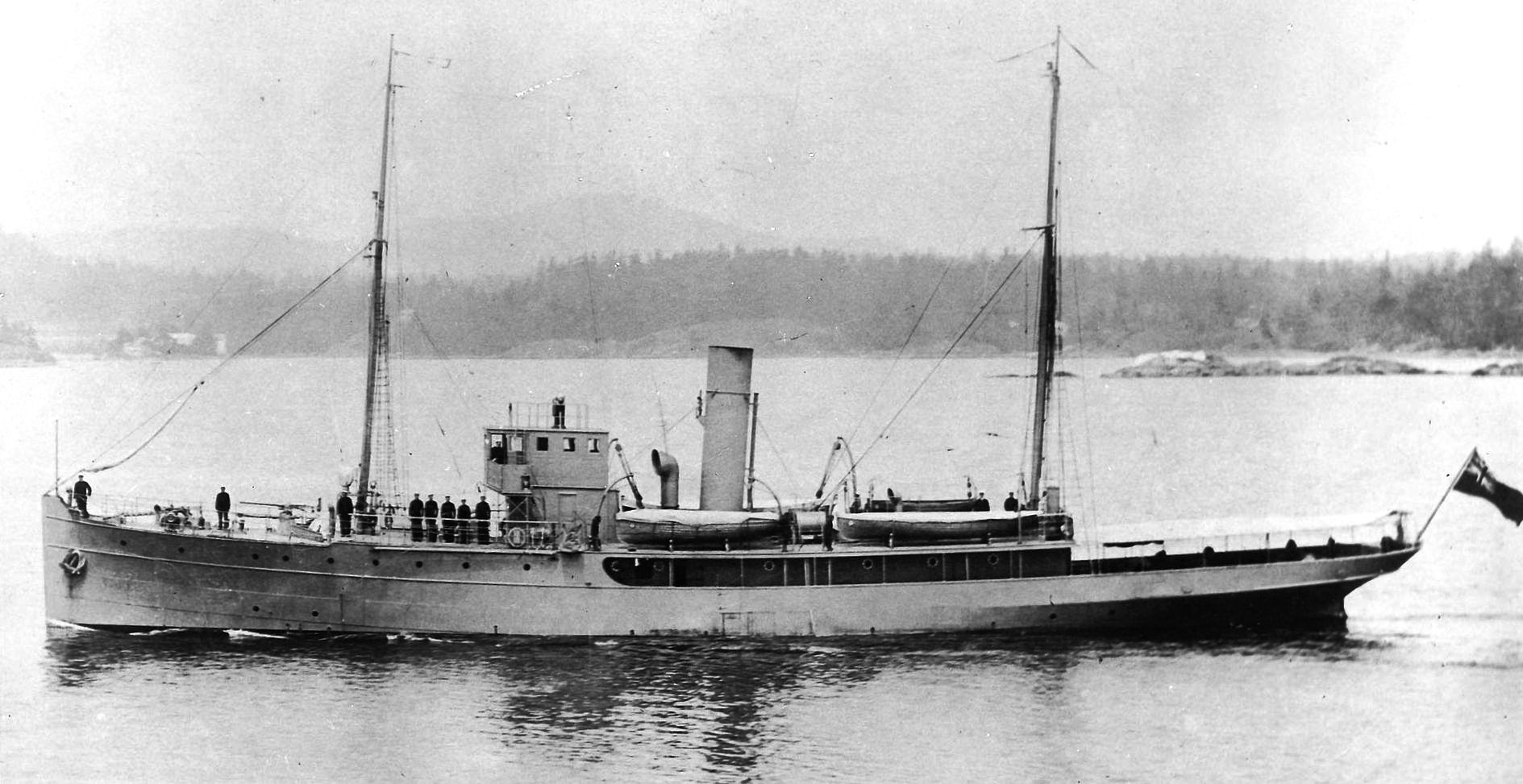 HMCS Restless (converted from civilian use)., this ship served throughout the First World War as an examination vessel on the west coast.  Built in 1906, she was purchased for fishery patrol two years later. She served as a training ship at the Royal Naval College of Canada, Esquimalt, from 1918 to 1920, when she was donated to the Navy League of Canada for sea cadet training. She was sold in 1927, but remained in commercial service until about 1950, when she was destroyed by fire in Saanichton Bay, BC.