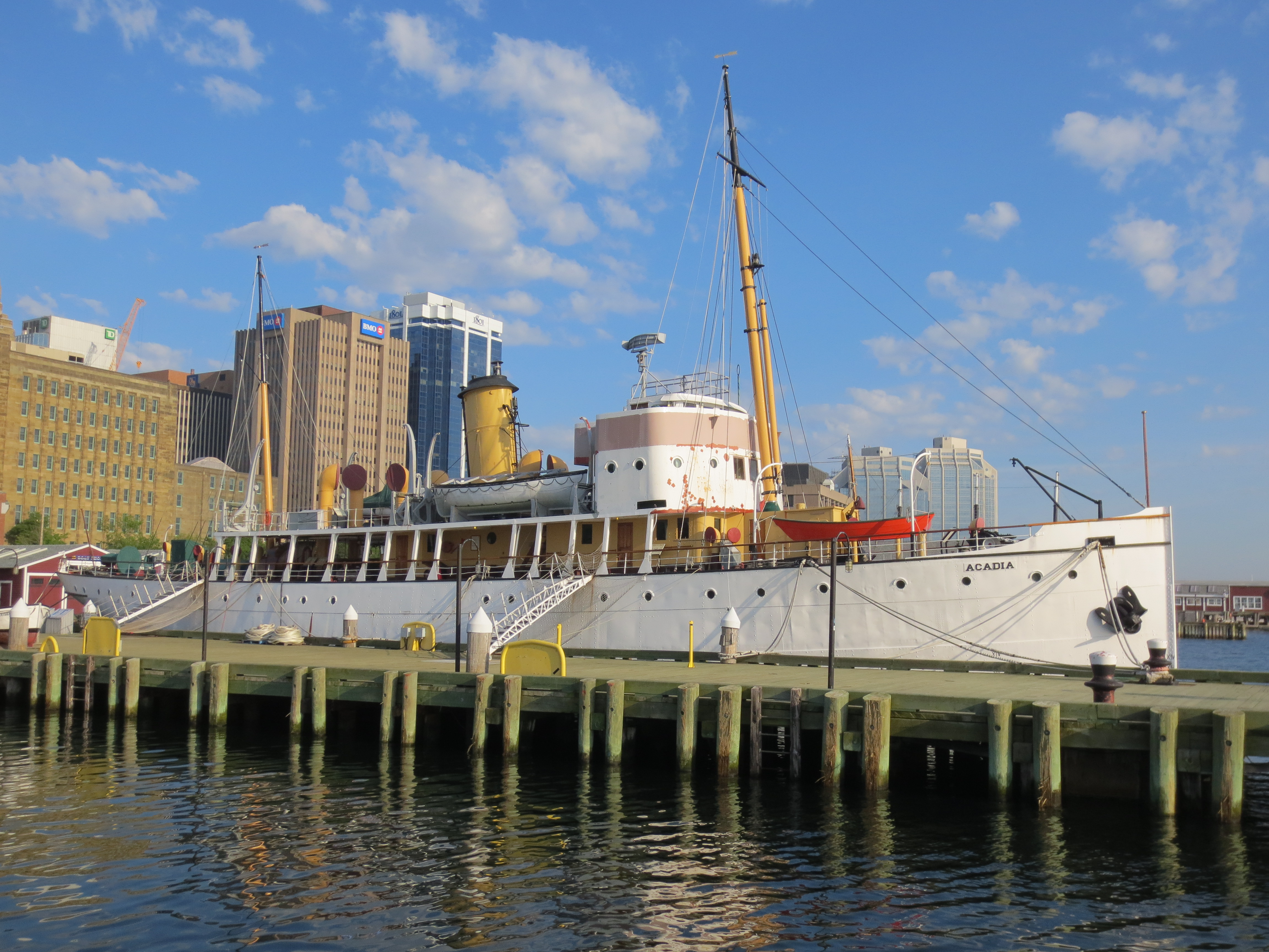HMCS Acadia, ca 1944.  She was a Dominion government hydrographic survey ship commissioned as a patrol vessel from 16 Jan 1917 to March 1919.  She carried out anti-submarine patrols in the Bay of Fundy as well as off the south shore of Nova Scotia and in the Gulf of St. Lawrence.  She then resumed survey duty until the outbreak of the Second World War when she was again commissioned on 2 Oct 1939, initially serving as a training ship for HMCS Stadacona, then later patrolling the Halifax approaches from May 1940 to March 1941.  She served as a training ship at Halifax for anti-aircraft gunners, and as a Defensively Equipped Merchant Ship (DEMS).  In June 1944 whe went to HMCS Cornwallis as a gunnery training ship.  She was paid off on 3 Nov 1945 and returned to the Dominion government.  She was retired from service on 28 Nov 1969 and today serves as a museum ship at the Maritime Museum of the Atlantic in Halifax harbour.