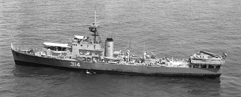 HMCS Buckingham (314) Prestonian Class Frigate, with Sikorsky HO4S-3 Sea Horse helicopter on the rear deck.