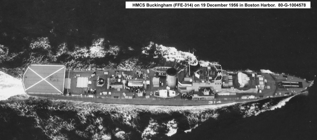 Laid down as HMCS Royalmount, she was renamed HMCS Buckingham K685 on 5 Apr 1944. Commissioned on 2 Nov 1944, at Quebec City, she proceeded to the east coast and sailed from Halifax on 18 Dec 1944 for Bermuda to work up. She returned in mid-Jan 1945, and in Feb 1945 was assigned to EG 28, as a member of which she carried out escort and patrol duty out of Halifax until VE-Day. In May she arrived at Shelburne, escorting the surrendered U-889. In Jun 1945 she began a tropicalization refit at Liverpool, NS, continuing it at Shelburne until 20 Aug 1945, when it was suspended. HMCS Buckingham was paid off on 16 Nov 1945 at Sydney and placed in reserve at Shelburne until 1946, when she was sold to Marine Industries Ltd. Re-acquired by the RCN, she was converted to a Prestonian class ocean escort (304), 1953-54, and re-commissioned for training purposes. Further modified by the addition of a helicopter landing deck aft, she carried out, Oct-Dec 1956, trials preliminary to the design of the destroyer helicopter carriers. On 13 Feb 1959, HMCS Fort Erie, HMCS Buckingham, HMCS Swansea and HMCS La Hulloise returned to Halifax after a 5 week exercise in southern waters that included a port visit to Kingston, Jamaica. In Apr 1963, 12 RCN ships, HMCS Algonquin, Micmac, Cayuga, St. Croix, Terra Nova, Kootenay, Swansea, La Hulloise, Buckingham, Cape Scott, CNAV Bluethroat and CNAV St. Charles, took part in NATO Exercise New Broom Eleven, an exercise designed to test convoy protection tactics. She was paid off for the last time on 23 Mar 1965. On 22 Mar 1966, Buckingham left Halifax under tow and arrived at Le Spezia on 11 Apr 1966 for scrapping. One of her 4-inch/45 QF Mk. XVI* Twin Gun turrets is preserved in the village of Buckingham, Quebec.