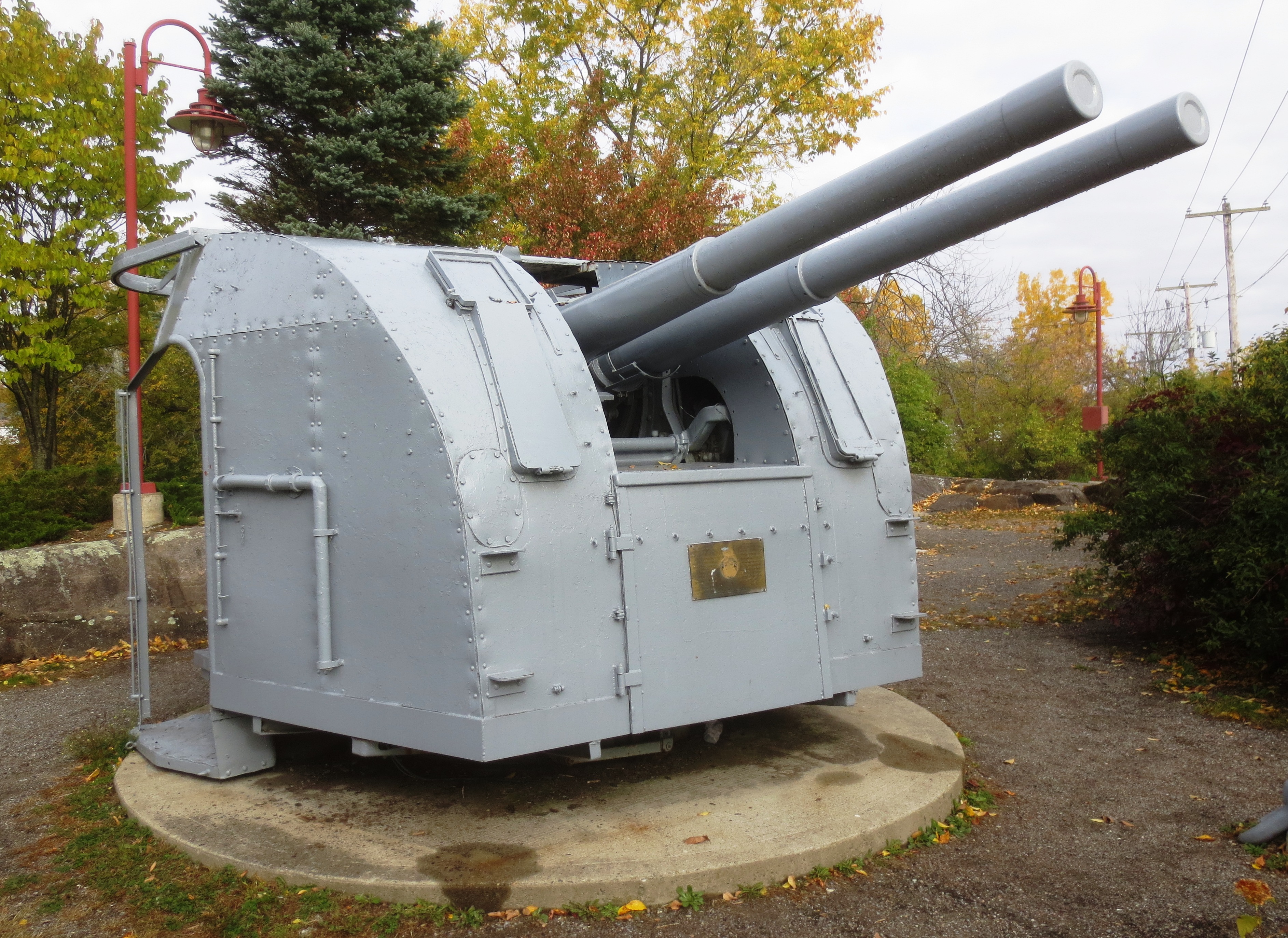 HMCS Buckingham (314) Prestonian Class Frigate. 4-inch/45 QF Mk. XVI* Twin Guns (Serial No. S/14556), L, left, and (Serial No. S/covered with paint), R, right, on a Mk. XIX High Angle mounting, from HMCS Buckingham. Buckingham, Quebec.
