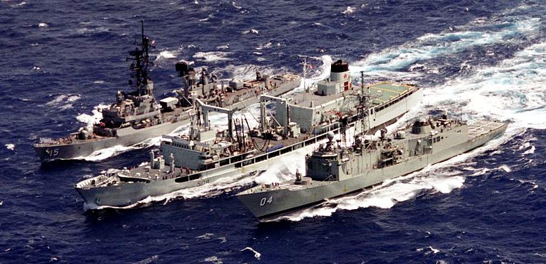 HMCS Provider (AOR 508) refueling the Royal Australian Navy guided missile frigate HMAS Darwin (FFG 04) and the US Navy guided missile destroyer USS Berkeley (DDG-15), during exercise “RIMPAC ’86”.