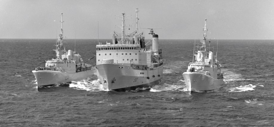 HMCS Protecteur (AOR 509), refueling the Canadian frigate HMCS Nipigon (266) off its port side and the Portuguese NRP Almirante Magalhaes Correa (F 474) off its starboard side, STANAVFORLANT 1981.