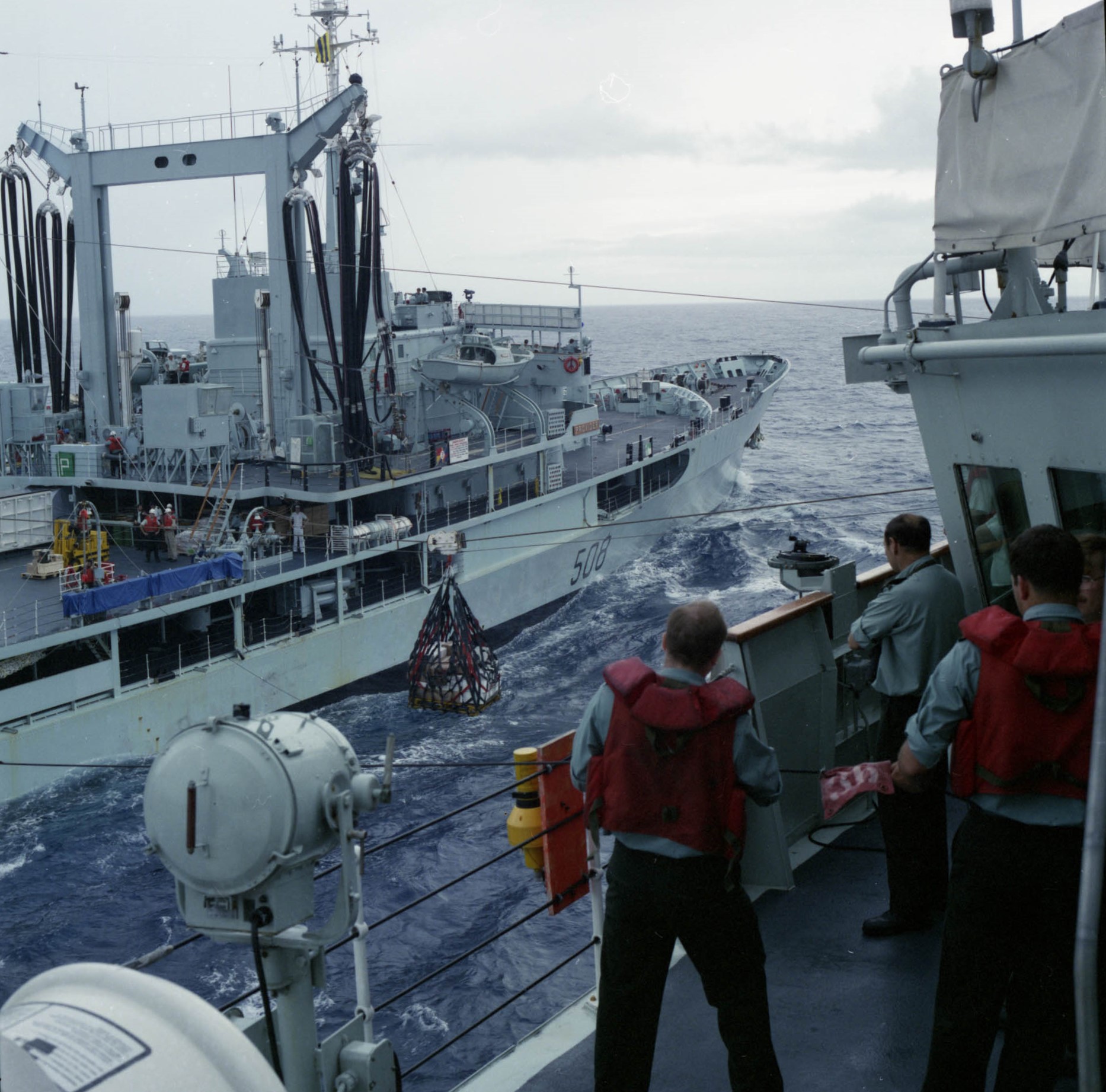 HMCS Provider (AOR 508) carrying out replenishment at sea, 20 May 1988. (Library and Archives Canada Photo, MIKAN No. 5056623)