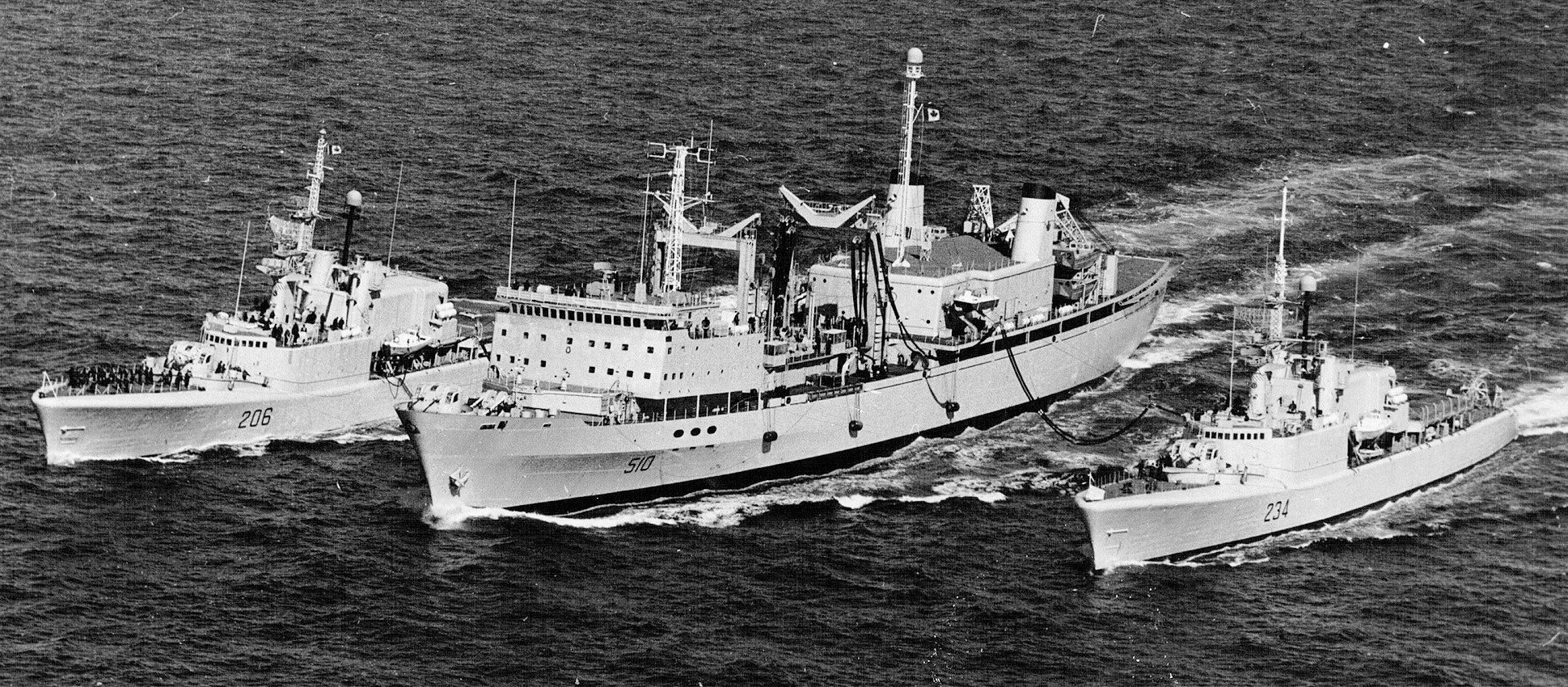 HMCS Preserver 510 conducting RAS with HMCS Saguenay 206 and HMCS Assiniboine 234.