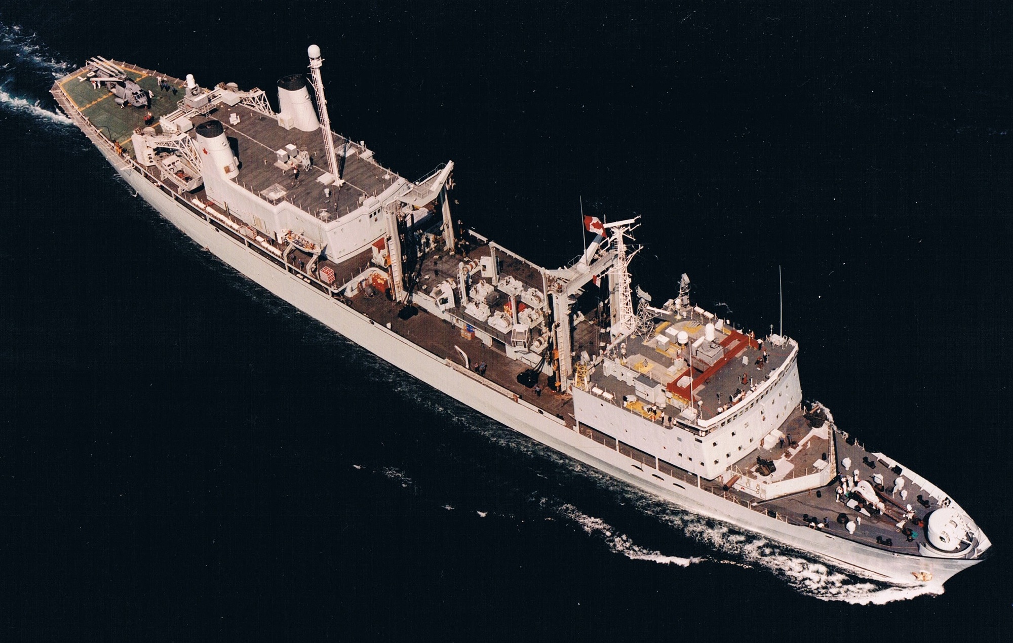 HMCS Provider (AOR 508) with a Sikorsky CH-124A Sea King helicopter on the ship’s flight deck, Feb 1990.