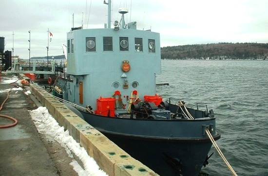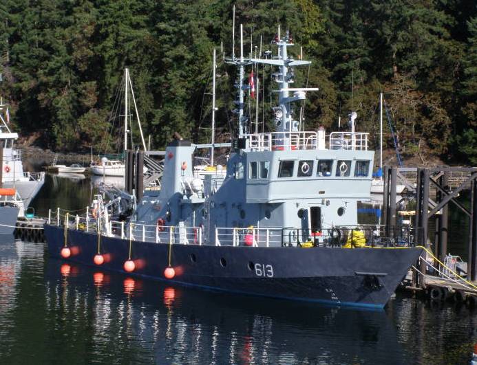 HMCS Bluethroat (AGOR 114).  Built as a controlled minelayer, she was also able to carry out cable laying work.  HMCS Bluethroat’s decks were painted red.  She was purpose-built for the RCN at Davie Shipyards – 156 ft length, 33 ft beam, a 10 ft draught and displacing 785 tons.