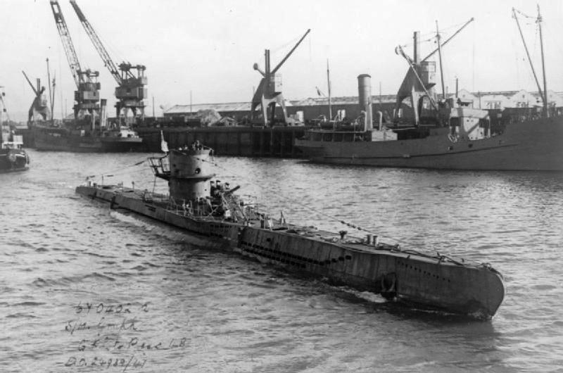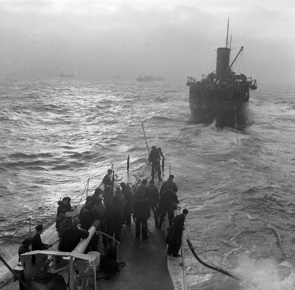 German U-Boat U-570 entering the dock at Barrow-in-Furness after her capture by the Royal Navy.