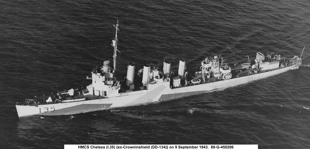 HMCS Chelsea (I35). Ex USS Crowninshield (Type B – Caldwell-Class) built by Bath Iron Works. The ship was laid down on 5th November 1918 and launched on 24th July 1919. Commissioned on 6th August 1919 for US naval service she was held in Reserve in 1939- The ship transferred to the RN under the UK/US Lend Lease Agreement on 9th September 1940 and commissioned as HMS CHELSEA on that date at Halifax in Canada. This name was common to a London Borough and a town in Vermont, USA. This name had not previously been used for an RN ship. After a successful WARSHIP WEEK National Savings campaign in March 1942 she was adopted by the civil community of Devizes, Wiltshire.