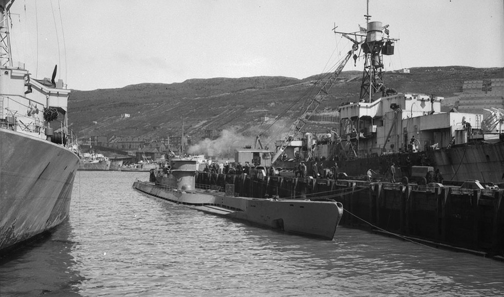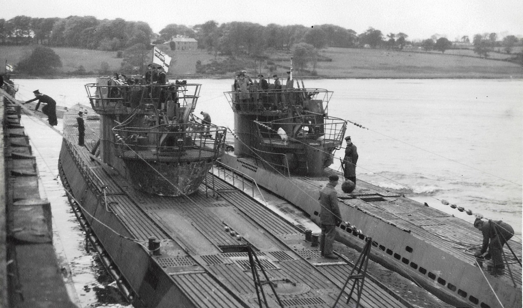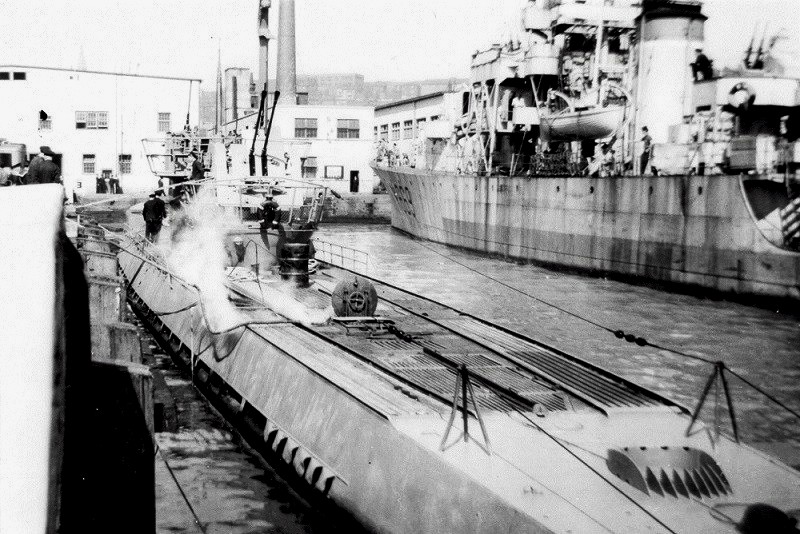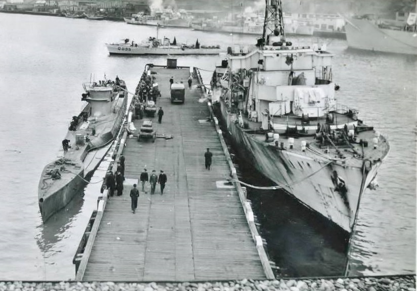 U-190, alongside HM Jetty, St Johns, Newfoundland, 15 May 1945.  HMCS Lanark (K669) on the left of the photo and HMCS Arnprior (K494) on the right