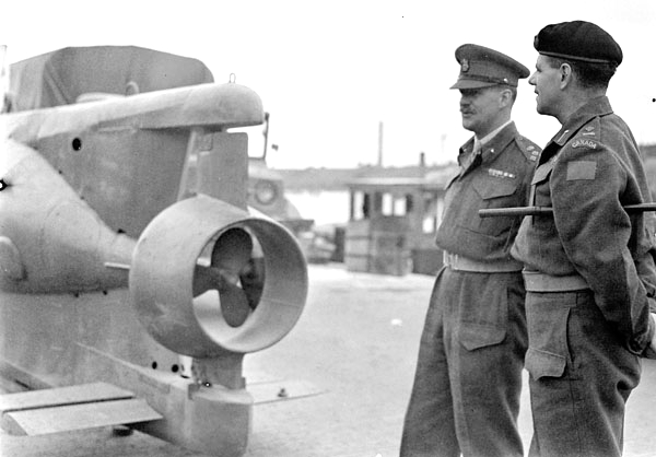 Brigadier J.A. Roberts of the 8th Canadian Infantry Brigade and Major-General Harry W. Foster, General Officer Commanding 1st Canadian Infantry Division, examining a small German two-man “Biber” submarine, IJmuiden, Netherlands, 25 May 1945.