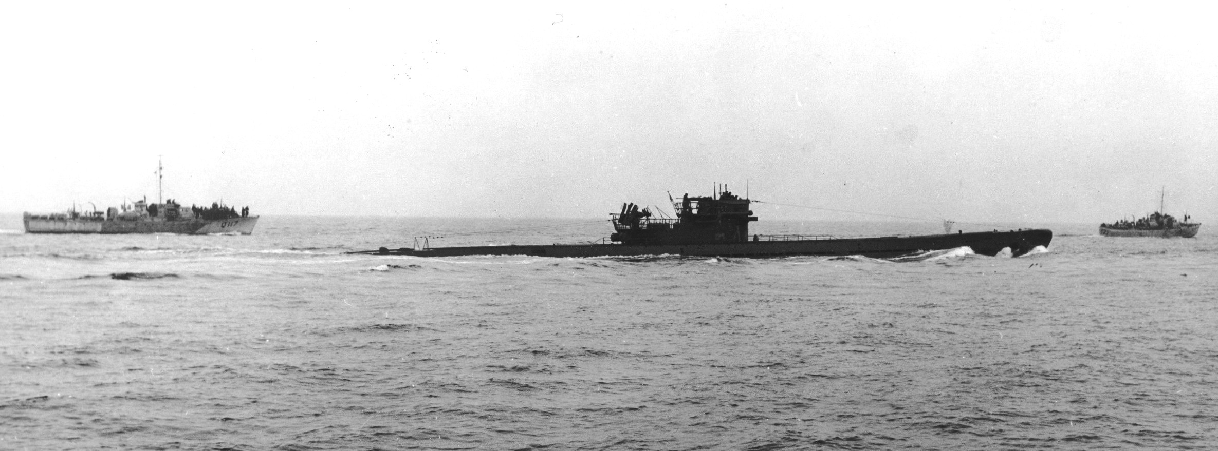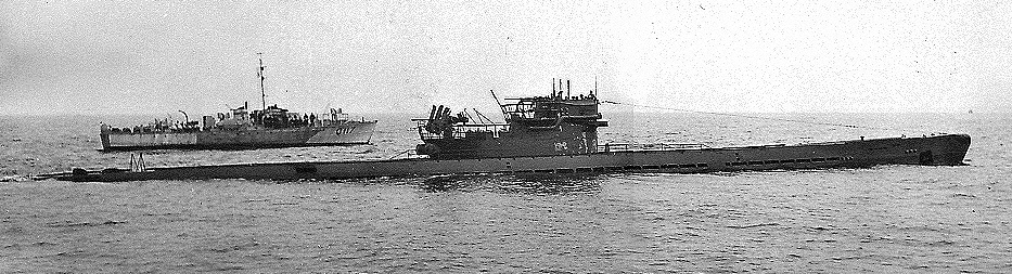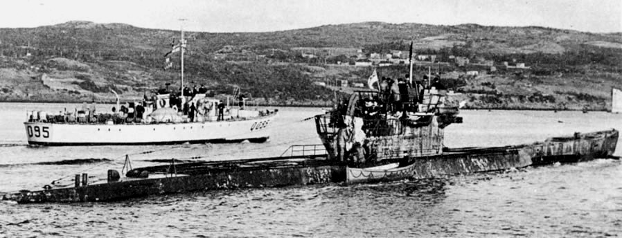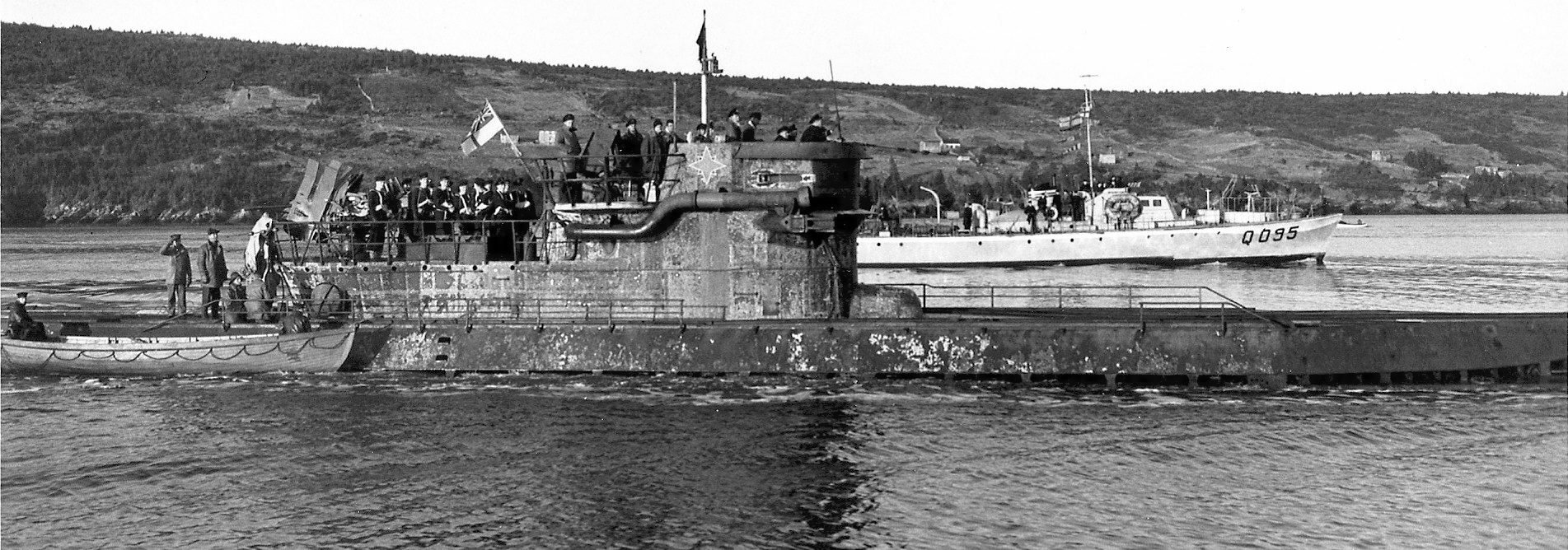 U-889 off Shelburne, Nova Scotia sescorted by the RCN crew of Fairmile Motor Launch Q117, 13 May 1945.