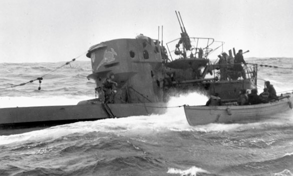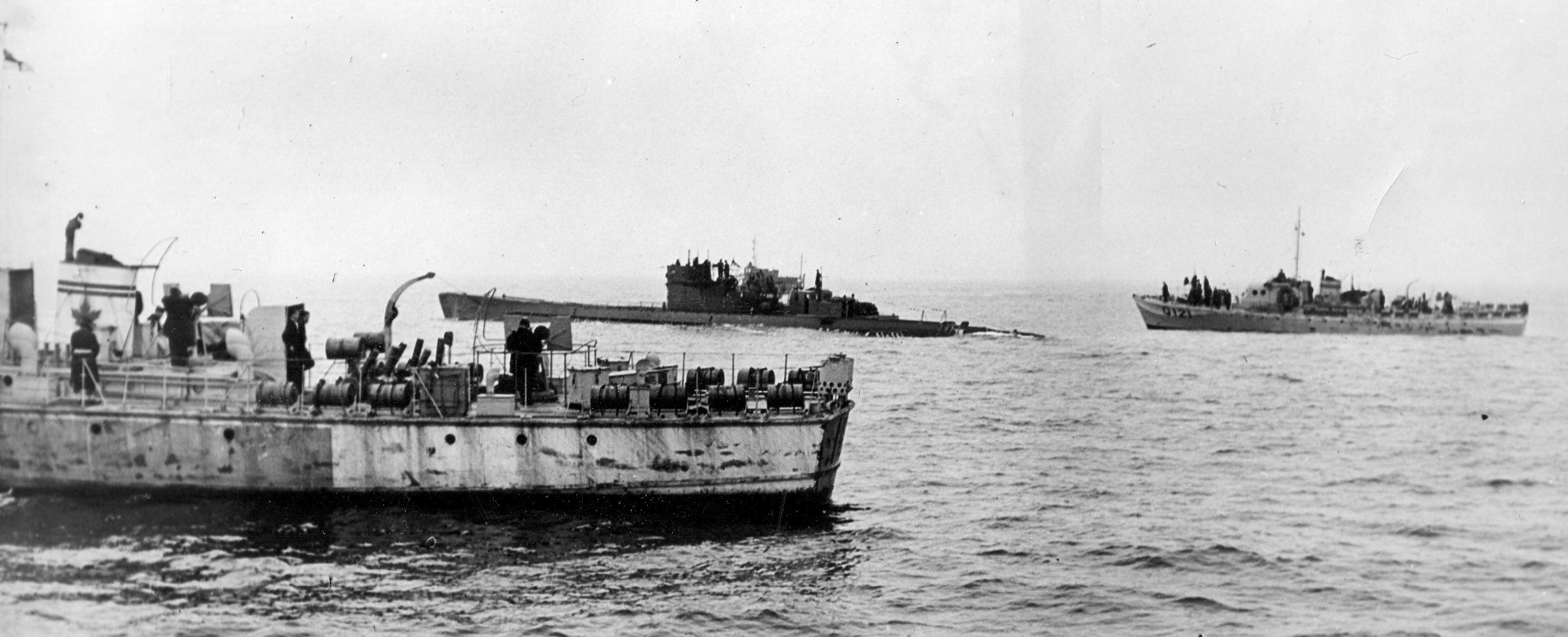 U-889 surrendering to the RCN crew of Fairmile Motor Launch Q117, 12 miles off Shelburne, Nova Scotia, 13 May 1945.