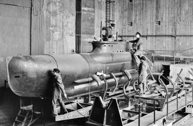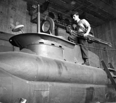 German two-man “Seehund” submarine, Kiel, Germany, 18 May 1945.  Canadian Army Film & Photo Unit Sgt.