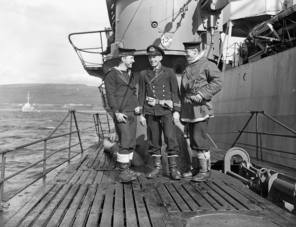 Members of a boarding party from HMCS Matane (K444), which accepted the surrender of a German submarine depot ship off the coast of Norway, seen aboard a surrendered German submarine, Loch Eriboll, Scotland, May 1945.